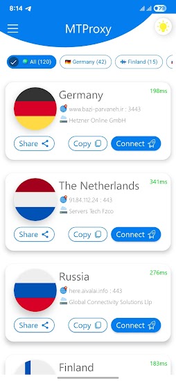 Android application MTProxy - Proxy For Telegram developed by Single Developers > is listed under category Tools. According to Google Play MTProxy - Proxy For Telegram achieved more than 100,000 installs. MTProxy - Proxy For Telegram currently has 1,175 ratings with average rating value of 3.91. The current percentage of ratings achieved in last 30 days is 1.17%, percentage of ratings achieved in last 60 days is 2.84%. MTProxy - Proxy For Telegram has the current market position #109814 by number of ratings. A sample of the market history data for MTProxy - Proxy For Telegram can be found below. Last update on 2026-01-04.